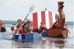 competitors a fixed build time, using only a predetermined number of cardboard sheets, glue, adding machine tape, and paint. Duct tape is also often a key ingredient. Once completed, teams must race their boats across a shallow pond or river, using similarly constructed oars. The boats will almost always flood, sink, or shred under the weight, mostly due to the difficulties of waterproofing cardboard. Awards are often given out for effort and spirit, instead of victory. Some offer two categories – Fast and Funny. Boats are inspected pre-race to determine if they are “fast” or “funny”. The funniest boat winner gets a prize regardless of speed or floatability! Life jackets are required for all participants.