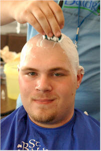 took pictures of each volunteer and made posters which we placed in local businesses and asked people to vote on who they thought would be the “Best Baldie”. We then held the head-shaving at the local high school after their last home basketball game. The Best Baldie was first crowned with a sash and fake flowers. Then we auctioned off each volunteer. Whoever bid the most got to shave the volunteer. Most volunteers had money lined up ahead of time and had it rigged to where people were bidding against each other to raise the bids. Several had collected money at work, for instance, and then had 2 assigned bidders the night of the auction. Our local professional auctioneer donated his time, and several local hairdressers donated the use of their shavers as well as their time. The last person to be auctioned was our dad, and since many people had come to bid that didn’t have someone to shave, we suggested pooling the rest of the bidders’ money and letting the grandkids shave my dad’s head. All winners shaved the volunteers simultaneously, each in their own creative way, which was quite a show! The professionals finished them off with razor blades. We raised $16,000!! The whole event was done secretly (my brother was initially in the hospital for 6 weeks). We videotaped the whole thing and the next day the Baldies went to the hospital to surprise him and showed him the video. This event works well in a small community.