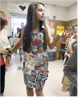 The project injected new excitement into student government’s fundraising efforts, Cola said. It also fit with some of the school’s core values, including honoring the legacy of its namesake, the naturalist John Muir. “Muir is really one of the few schools that has been recycling for the last 10, 15 years,” Cola said. The sole male model, Gianluca Vitagliano, 12, wore a gladiator-inspired outfit made of Scantron test sheets, pages from a dictionary and the Muir Middle School student newspaper. Maya Bellow decided to go with an Earth theme for her design, which featured sea shells, raindrops and flowers. “I spent a long time – two weeks,” Maya said. “I am really pleased.”