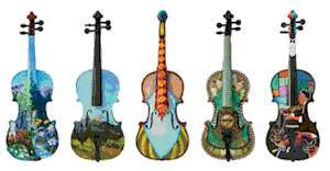 Durango, CO: Combine intriguing art with Durango’s premier classic music festival Music in the Mountains and what do you get? Violins and Vino, a great combination in any book. Traditionally, the festival has kicked off with a fundraising soirée at Toh-Atin Gallery. In 2013, the event moved from the end of January to the end of March, which made for lighter spirits all around. Instead of a musical performance and an auction of private musical performances, this year’s festivities included an auction of violins painted and decorated by talented local artists along with just a few performances for sale – others were used at mini-concerts and fancy dinners as fundraisers for Music in the Mountains throughout the year, including From Russia with Love in February and April in Paris. Twelve artists received a gleaming new $75 violin, and most said the hardest part was marring that finish to get it ready to be a “canvas.”